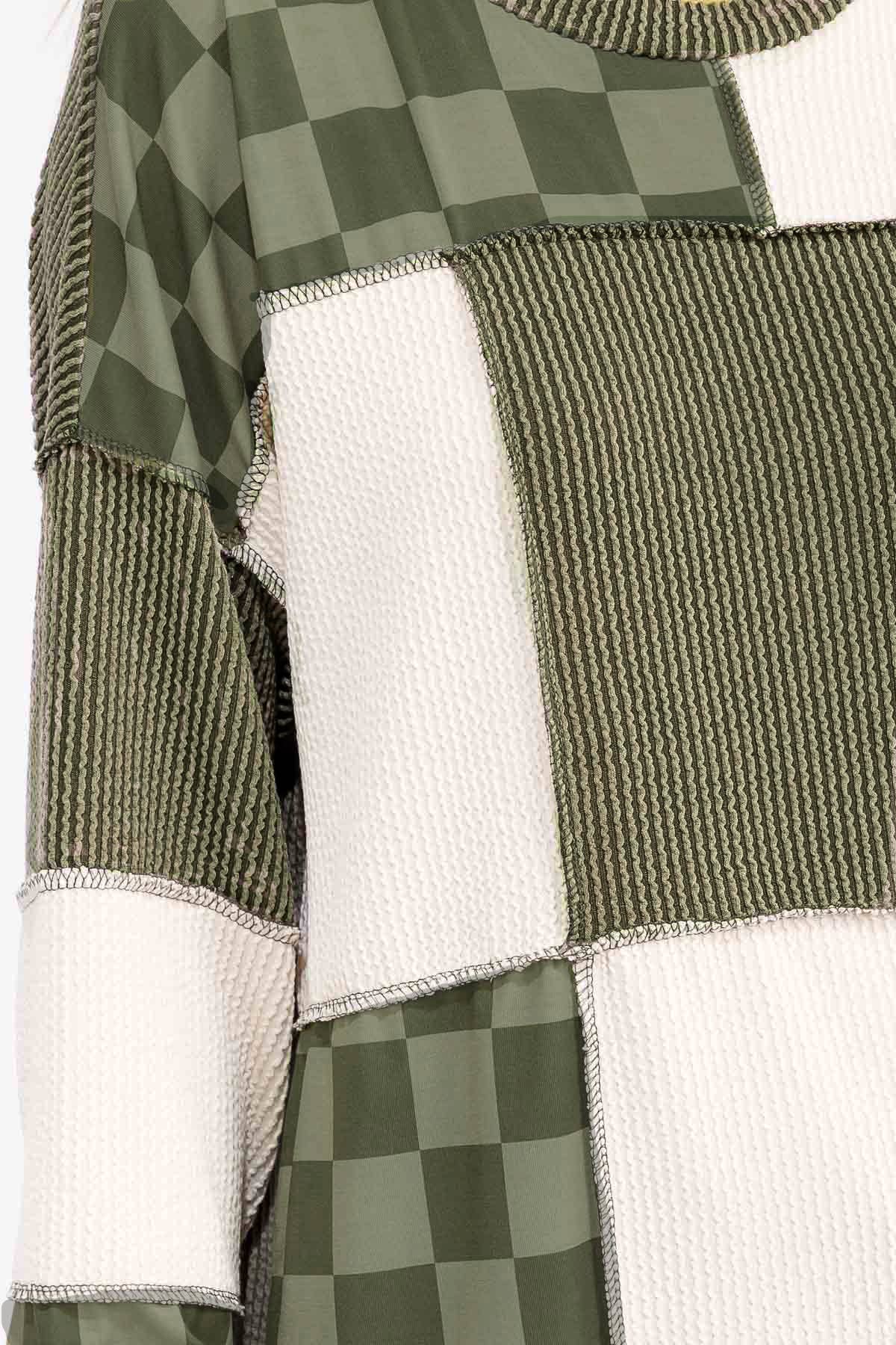 Patchwork Rib And Checkerboard Pullover Top